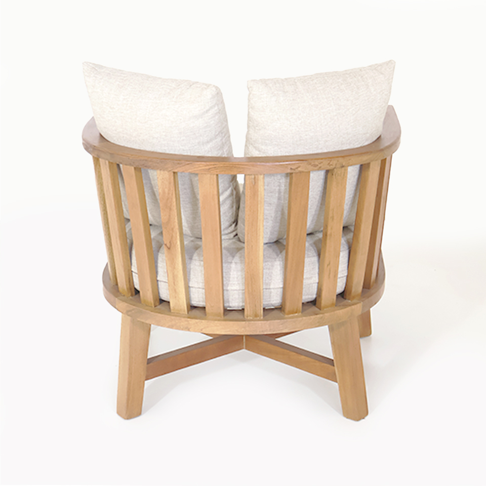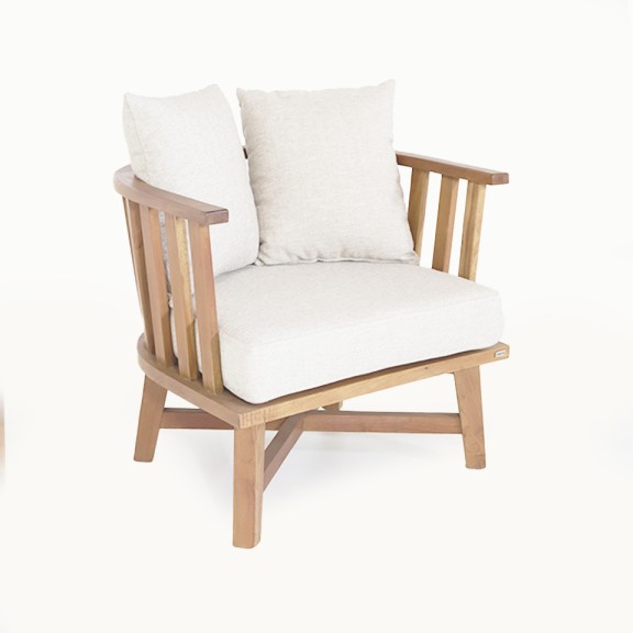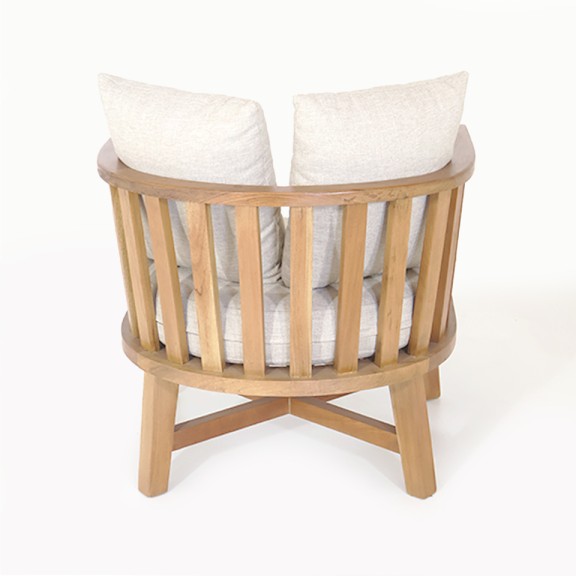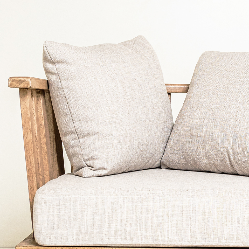 POLTRONA DEVOTO 01 CON ALMOHADAS TELA DE HILO BEIGE OSCURO. MADERA LUSTRE 1