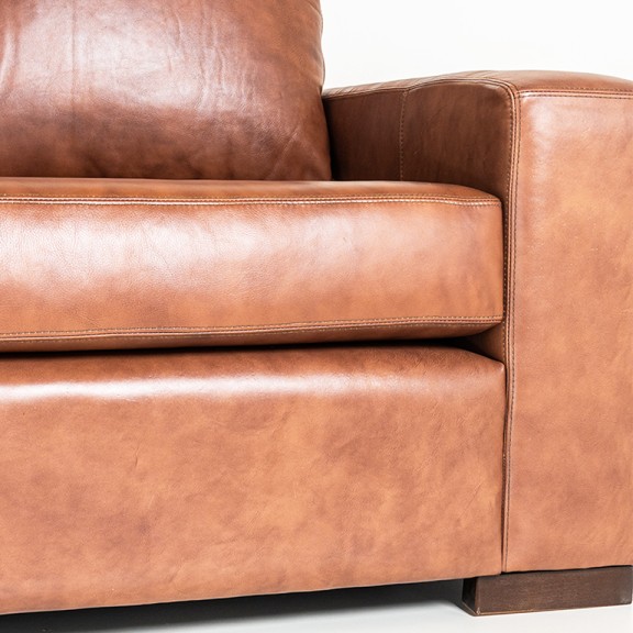 SOFA RECTO 01. CUERO MARRON MAREADO CON COSTURA PATA NOGAL
