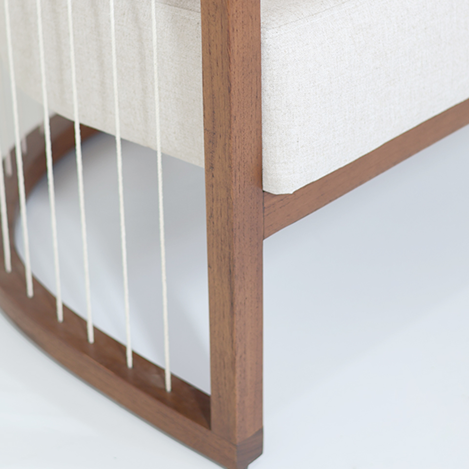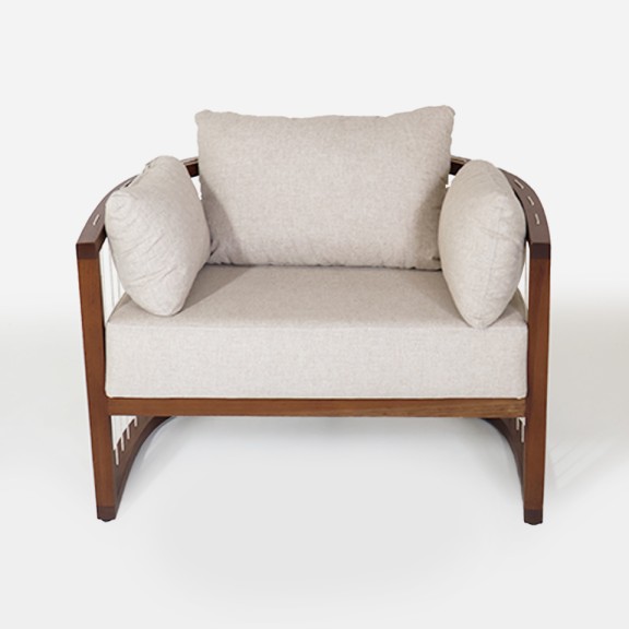 POLTRONA EVA 01 CON ALMOHADONES TELA DE HILO BEIGE OSCURO. LUSTRE ROBLE MIEL
