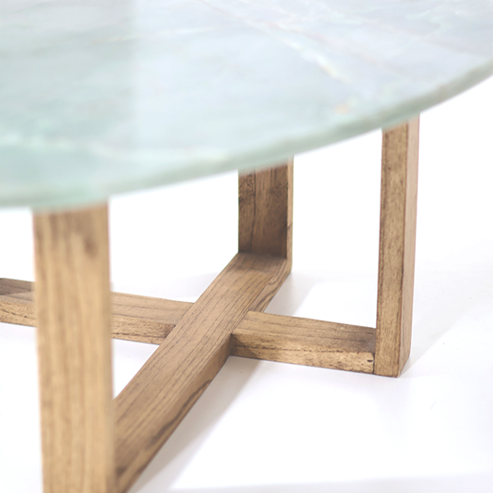 MESA DE CENTRO CON BASE DE MADERA MACIZA. LUSTRE RESTO 1, ACABADO SEMI MATE, CUATRO REGATONES. TAPA DE CUARZITA COLOR VERDE.