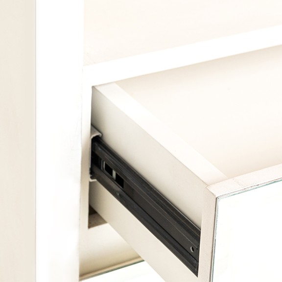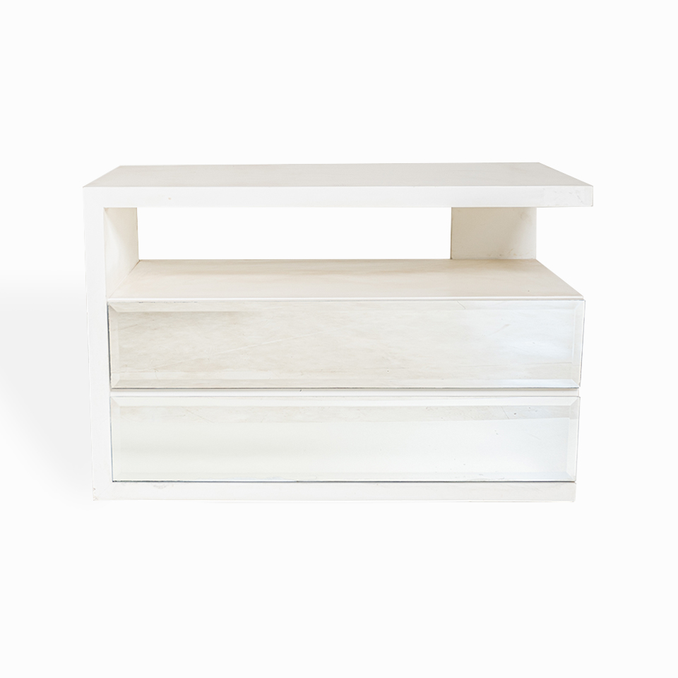 MESA DE LUZ NILSA 01. 2 CAJONES. 1 ESPACIO CON ESPEJO BISELADO. LUSTRE BLANCO