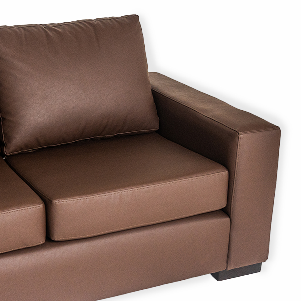 Tapizado en simil cuero color marrón, aporta calidez y elegancia, adaptándose fácilmente a distintos estilos de decoración. Sus patas en tono nogal complementan el diseño con un acabado sofisticado.