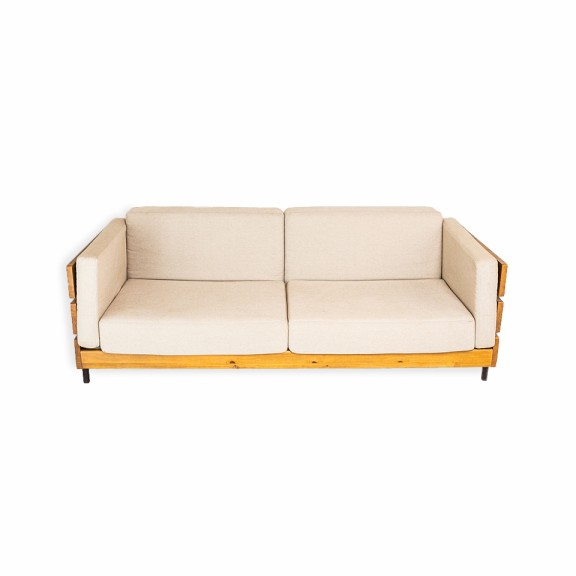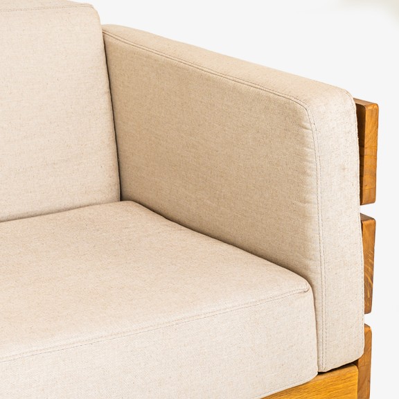 Tapizado en tela de hilo color beige, aporta calidez y versatilidad, adaptándose fácilmente a distintos estilos de decoración. Su estructura con detalles en madera visible realza el diseño, sumando carácter y sofisticación.