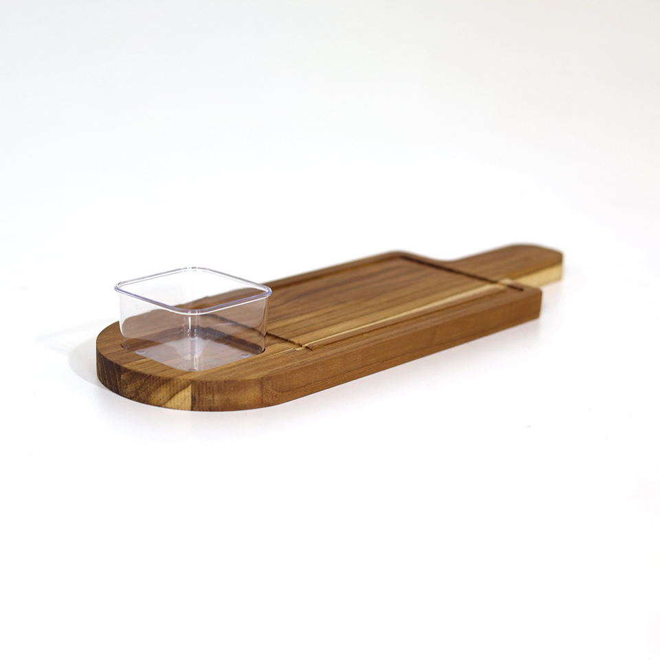La Tabla para Servir 177 con mango tipo teca y 1 recipiente acrílico es una opción práctica y elegante para quienes buscan una presentación simple pero con diseño.