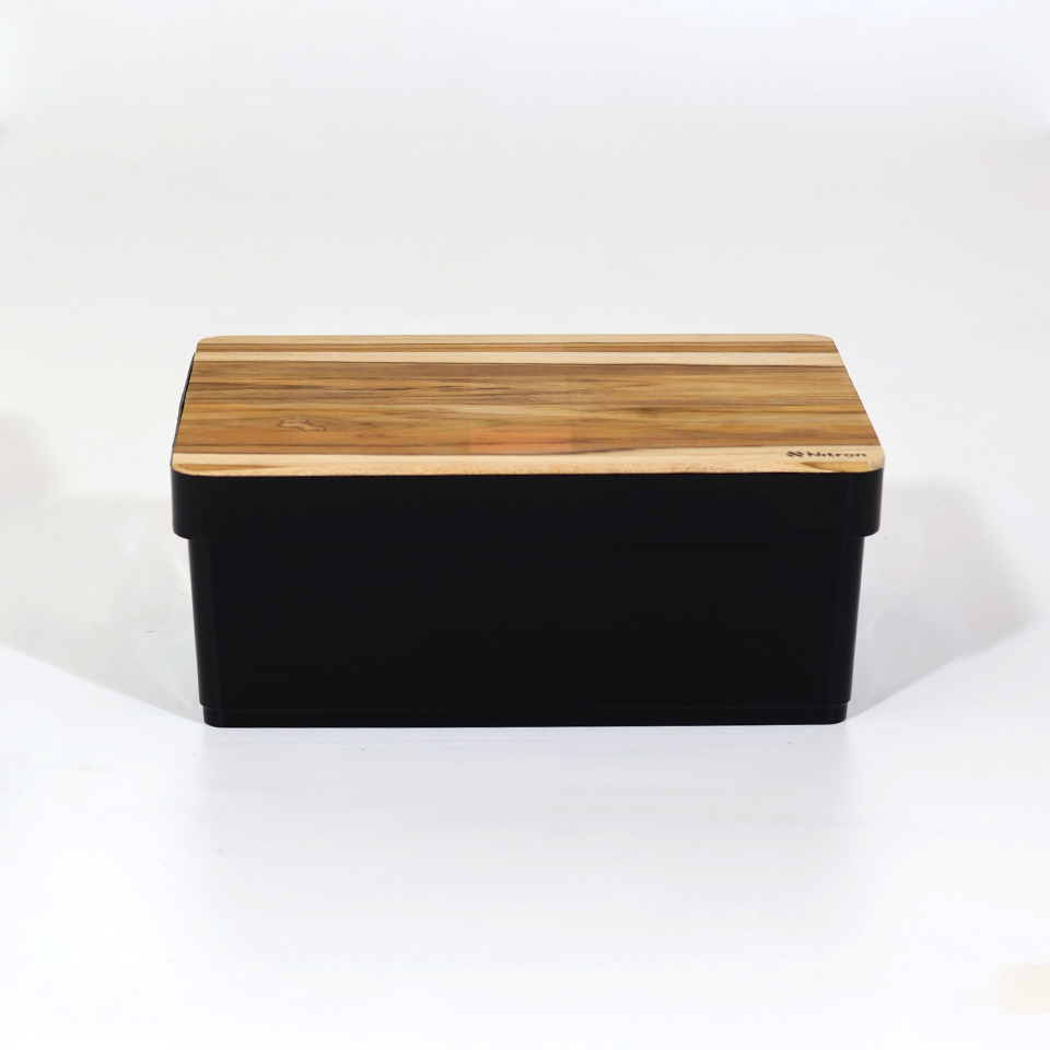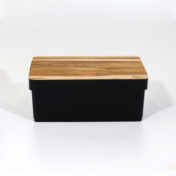 Gracias a su formato plano, es ideal para guardar debajo de la cama, en placares o estantes bajos, aprovechando al máximo cada rincón. Su base en color negro aporta un estilo moderno y elegante, mientras que la tapa con acabado tipo madera teca suma calidez al ambiente.
