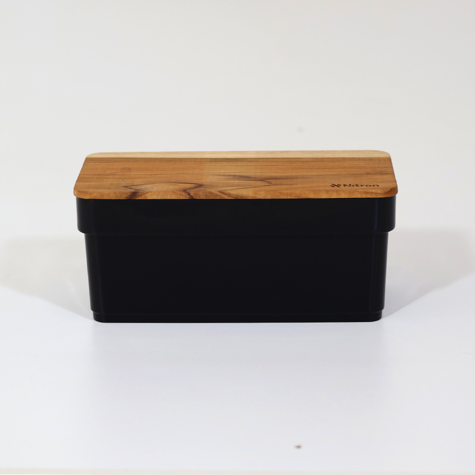 Caja organizadora plana 2.35L con tapa efecto teca, ideal para aprovechar espacios reducidos como debajo de la cama, estantes o placares.