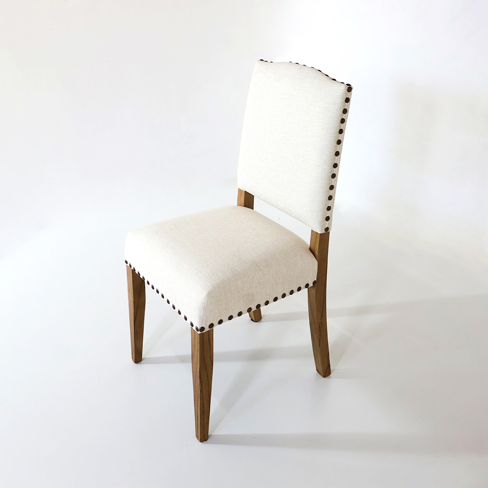 SILLA GERALDY 01. ASIENTO/RESPALDO TAPIZADO CON TACHAS. TELA DE HILO BEIGE CLARO. MADERA RESTO 1.