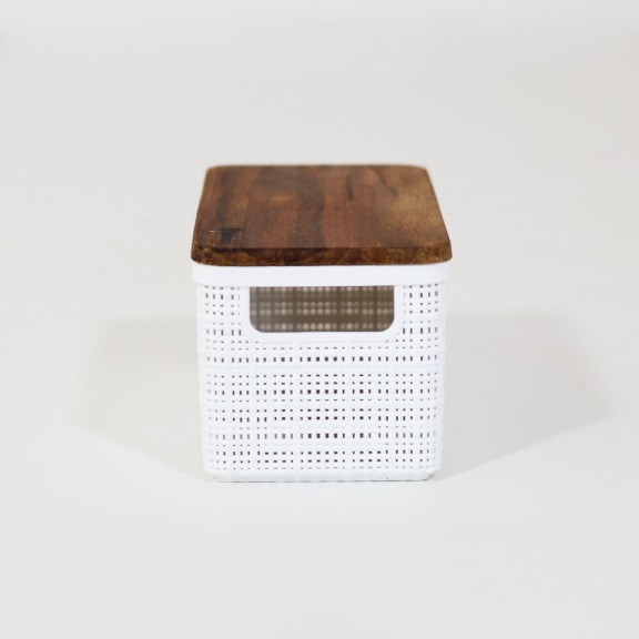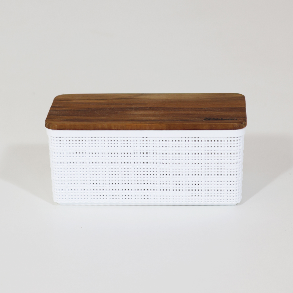 Caja organizadora alargada de 1.5L con tapa efecto teca, ideal para aprovechar espacios estrechos como estantes, baños, escritorios o interiores de placares.