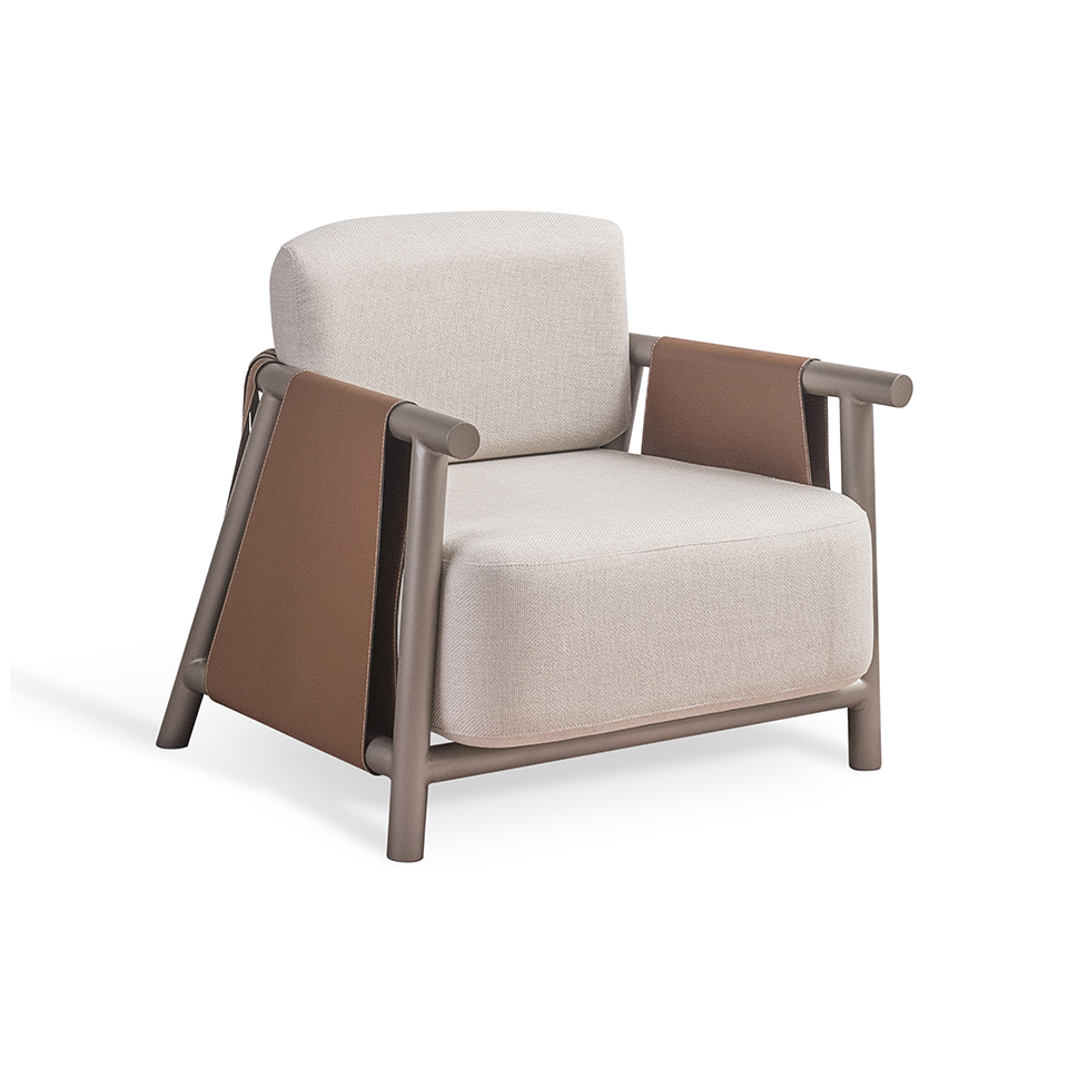 POLTRONA ARABELA ANK 87 TELA DE HILO BEIGE OSCURO CON TIRA DE CUERO MARRON /ACABADO LACA TABACO