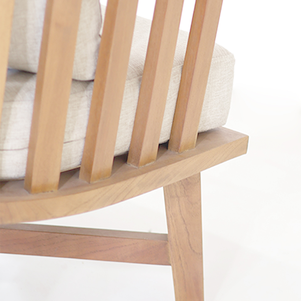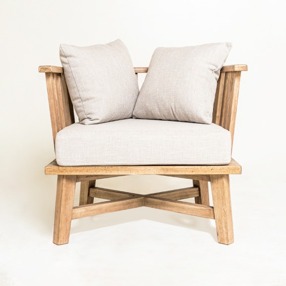 POLTRONA DEVOTO 01 CON ALMOHADAS TELA DE HILO BEIGE OSCURO. MADERA LUSTRE 1