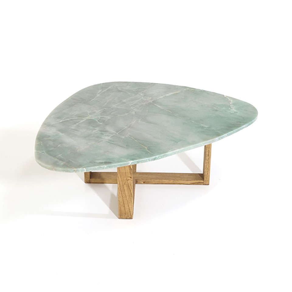 MESA DE CENTRO CON BASE DE MADERA MACIZA. LUSTRE RESTO 1, ACABADO SEMI MATE, CUATRO REGATONES. TAPA DE CUARZITA COLOR VERDE.