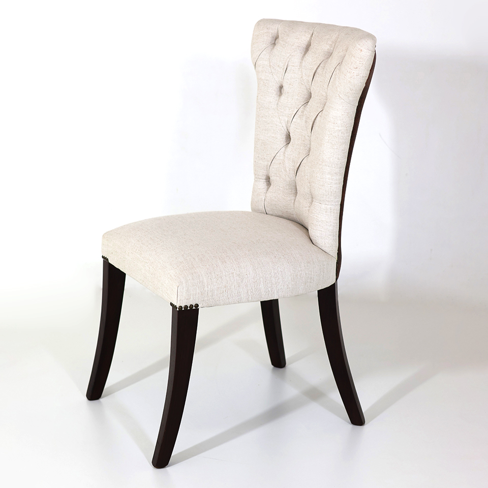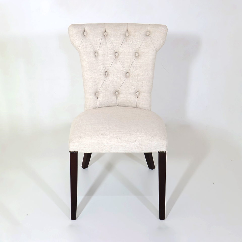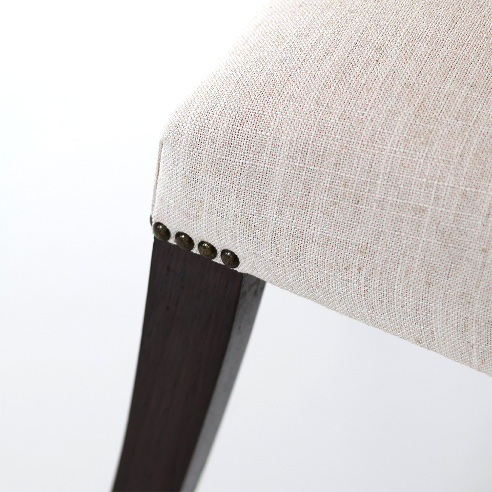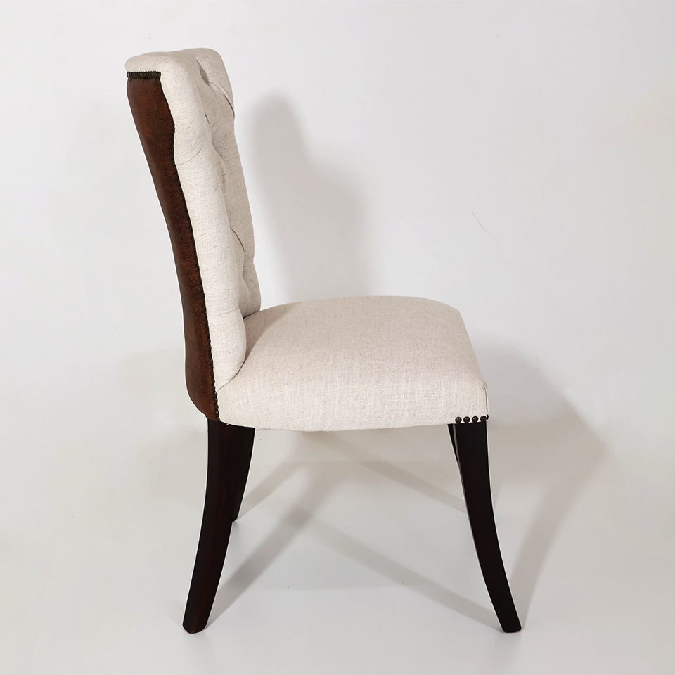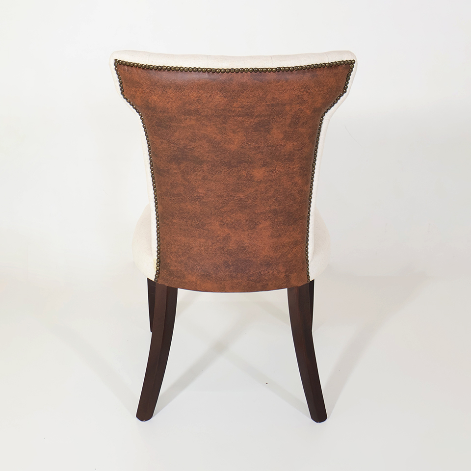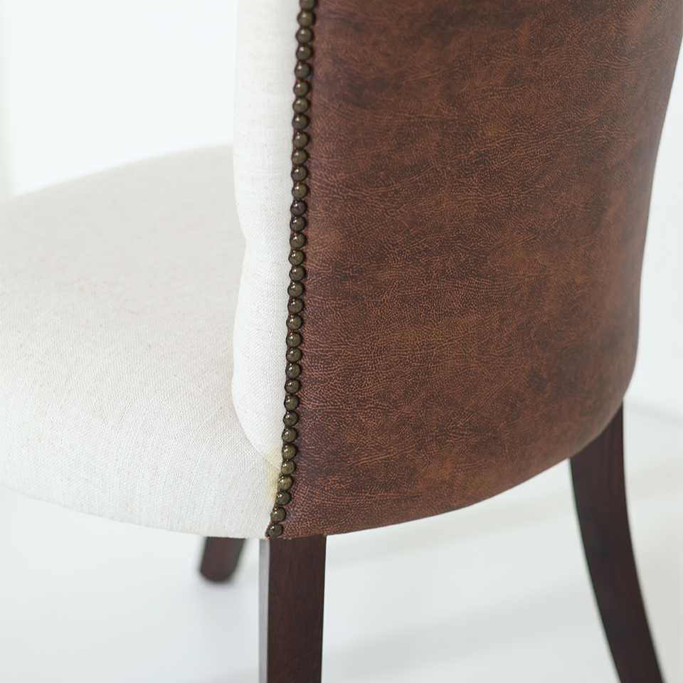 Tapizado en tela de hilo color Beige claro combinado con Símil cuero marrón | Con capitoné y tachas | Patas de madera color Nogal
