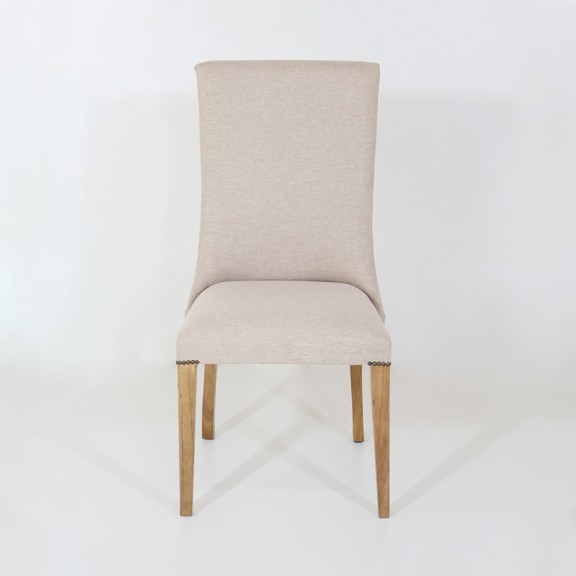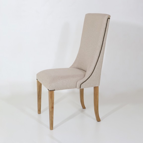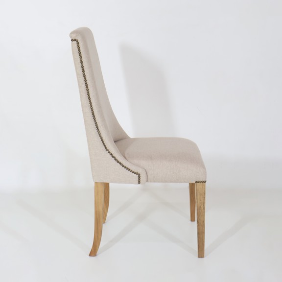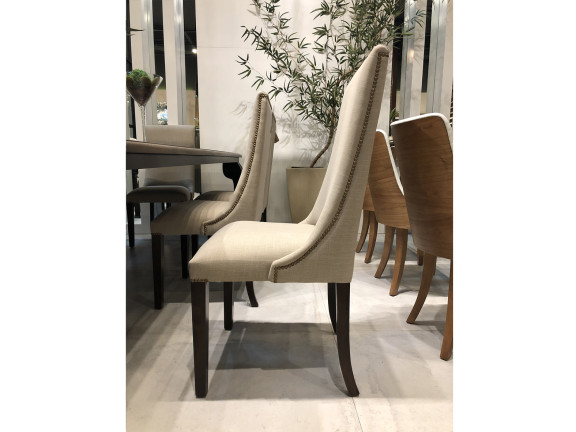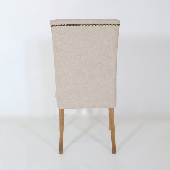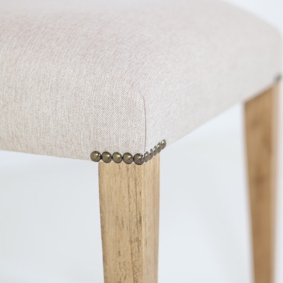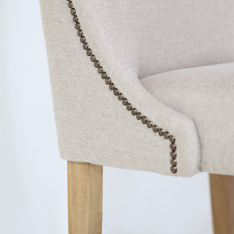 Tapizado en tela de hilo beige oscuro | Con capitoné | Con tachas en los laterales | Patas de madera color Nogal